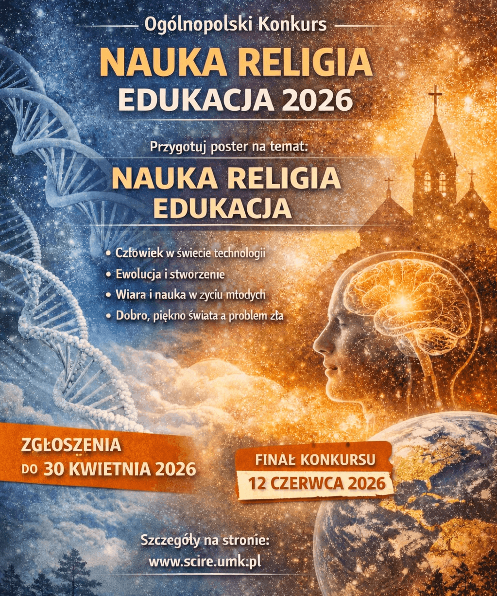 Ogólnopolski Konkurs „Nauka, religia, edukacja 2026” adresowany jest do uczniów szkół ponadpodstawowych 🎓, którzy w formie posteru naukowego 🖼️📊 podejmą temat relacji nauki i religii we współczesnej edukacji 🔬✝️📚.